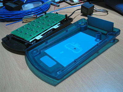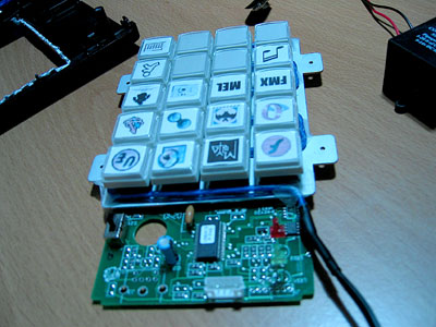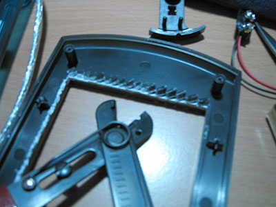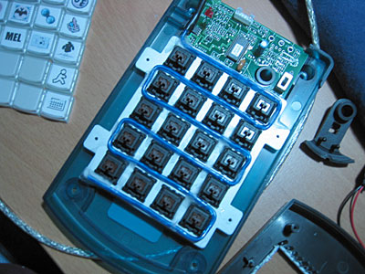 | Snap all the buttons back into place. This is a good view of the factory heat shrinking the EL wire came with, and the place where I mentioned you'd need to cut a groove in the upper half of the case to allow for it to sneak out. This is also a good time to plug CoolNeon. They're a very good company to do your EL business with. They have wire in bulk for $1.50/ft (minimum 100' for that price), which is a pretty competetive. |