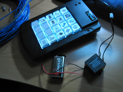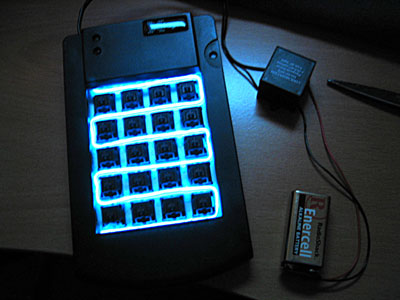 | Lit up without the keys, powered by a CoolNeon pipsqueak driver and one Radio Shack Enercell™ 9volt battery. I will be getting a low-profile wallwart for this from Radio Shack to avoid constant battery replacement, and I'll probably mount a switch in the case. Probably an SPDT pusbutton, or maybe I'll go all digital, and allow for turning it on and off through the PC. Or maybe I'll give up, and just go with the switch-mounted-in-the-case idea... |