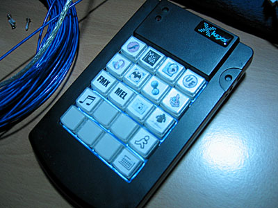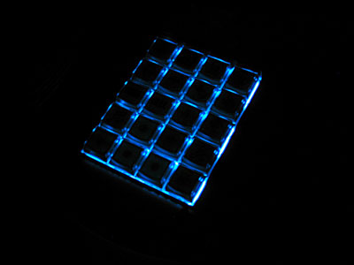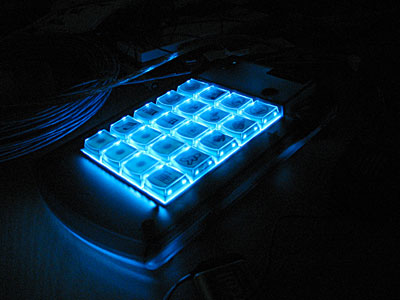 | Here's how it looks in complete darkness. I'm a little disappointed that it doesn't illuminate the button faces at all. It throws them into stark silhouette. The buttons have clear tops, but typical tan/grey bottoms, which obscure the light. PI Engineering, makers of X-Keys Programmable Keypads don't seem to make clear keys, but they do have some colored buttons that are translucent. I might pick up some in Blue (XK-A-004BL) Retail Price $4.50. |