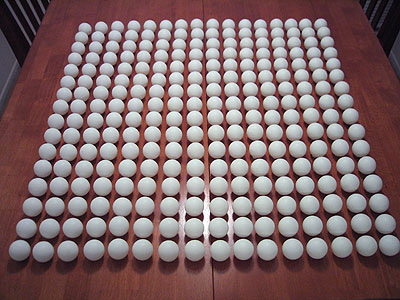 If you've ever wondered what 256 ping pong balls would look like, this is it. I've definitely been interested in "the grid" for awhile, and in the idea behind pixels - putting a grid of something together to create a perceived image. 16x16 is a very small grid, but it's already 256 individual ping pong balls (of 288 ordered). This hand-spaced grid is about 29" (73.66cm) square. Ping pong balls are 1.5" (3.81cm) wide, so pushed together, this would make a grid 24" (60.96cm) wide each way. I like the idea of a perfect 2' square - that figure has shown up in other lamp designs of mine. I'm not sure yet if I want a grid lamp, though, or maybe something more organic, and hence, harder to build, which may decide for me that this should remain a simple grid layout.