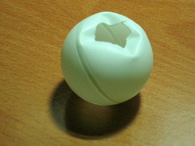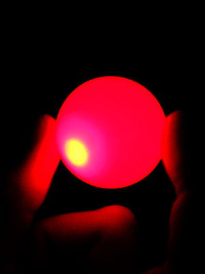 Soon after playing with the StrobeFX, I bought 288 balls (2 gross) for about $16 on Ebay. I figured that was a good number to start with. They turned out to be extremely cheap - very poorly made, with irregular/mismatched seams, slightly oblong shapes, some had what might be dark, dried mold in the seams, a few were dented, and all had extremely varying wall thickness, making certain sides almost paper thin, and others quite thick, meaning none of them will roll in a straight line. Some won't roll at all, opting to wobble in place. Still, they worked for my simple lighting ideas, so it was a bargain. Here's a dented one I found on the top of the pile and cut a hole in to test lighting it from the inside with a bright red LED.