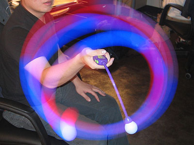 I mentioned to a friend at work how I'd like to build a wall lamp with ping pong balls that not only lit up, but could be any color, and he brought in his "StrobeFX" to let me have a look at an idea that uses the concept. StrobeFX is a rubberized ping pong ball on the end of a flexible stick. A battery and control box powers an RGB LED inside the ball, allowing it to change between a variety of colors. You can pick a number of different strobe and fade patterns, then swing the stick all around to paint streaks of multicolored light in the air. It gave me hope that the ping pong ball lamp could look awesome. It was quite a striking sight.